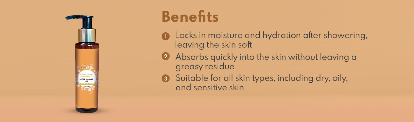 An after shower oil offers immediate hydration for the skin without the tacky feeling. Mandarin essential oil is known for its bright, citrusy scent and skin-brightening properties, while lavender essential oil is prized for its calming aroma and skin-soothing benefits. Together, these oils help hydrate and nourish the skin, promote relaxation, and leave a lingering, refreshing fragrance after showering.