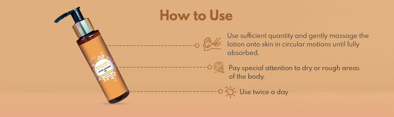 After showering, while your skin is still damp, take the after shower oil in your hands and massage it onto your skin, focusing on areas that require extra hydration. Allow the oil to absorb for a few minutes before getting dressed. Use daily for a nourishing and moisturizing effect. Enjoy the soothing scent of mandarin and lavender. Store the cream in a cool, dry place, away from direct sunlight. Keep away from children. Patch test before use.