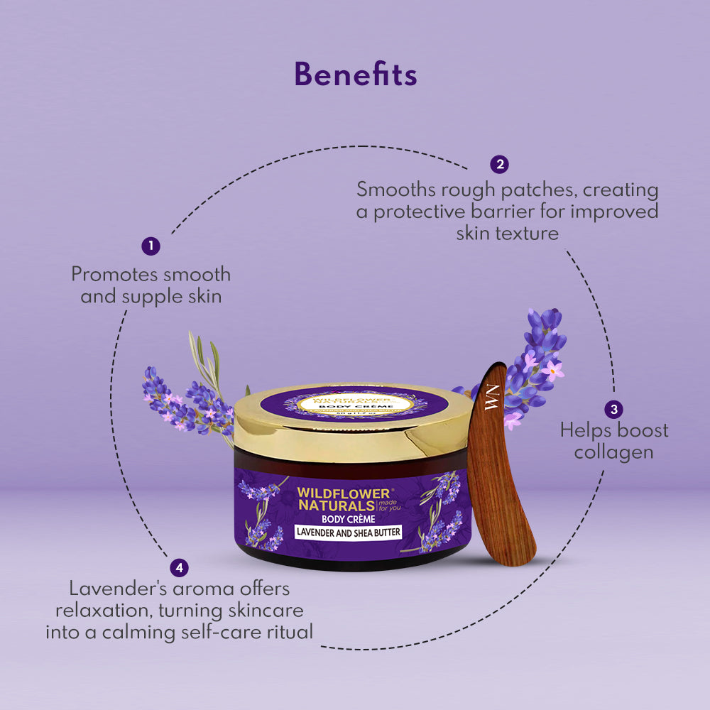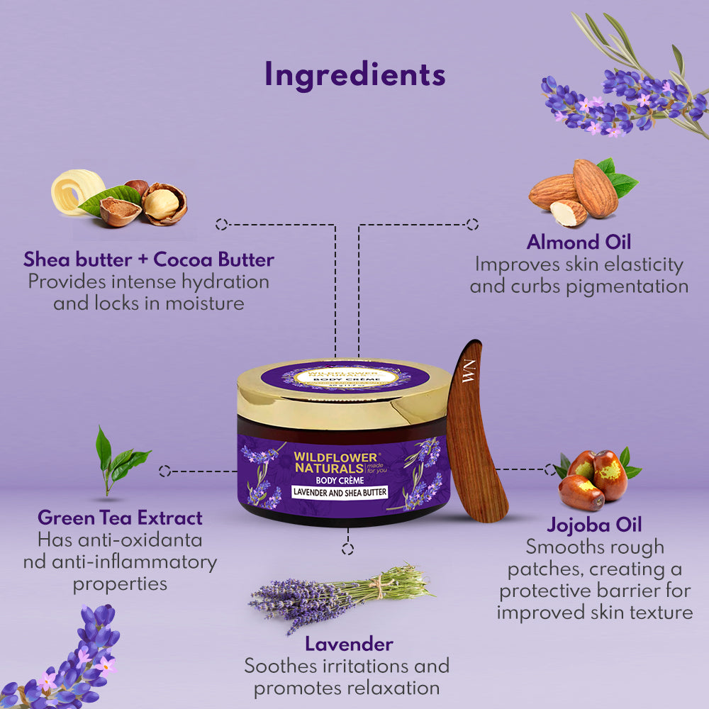 Lavender is a versatile ingredient with multiple benefits for the skin. In a body cream, lavender can help calm and soothe the skin, reduce inflammation, and promote relaxation. Its aromatic scent can also help alleviate stress and promote a sense of well-being.