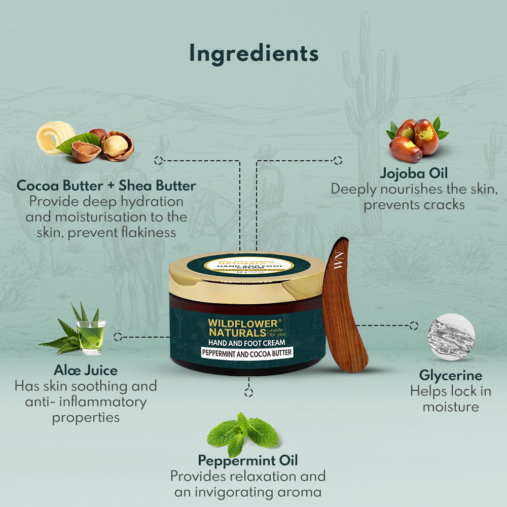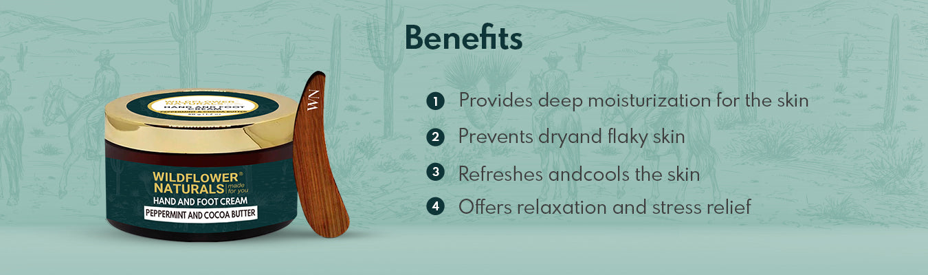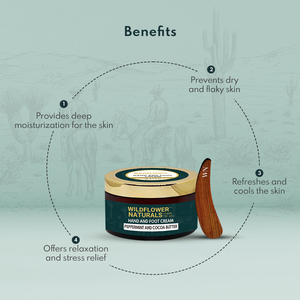 The Hand and Foot Cream with Peppermint and Cocoa Butter offers a range of benefits for the skin. Peppermint provides a cooling and refreshing sensation, making it ideal for tired and achy hands and feet. Cocoa butter is deeply moisturizing and nourishing, and helps to soften rough skin and provide long-lasting hydration.